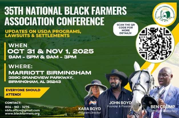 The National Black Farmers Association (NBFA) will convene its 2025 Annual Conference in Birmingham, Alabama, from October 31 to November 1, uniting farmers, policymakers, and civil rights advocates from across the country for two days of education, empowerment, and strategy.